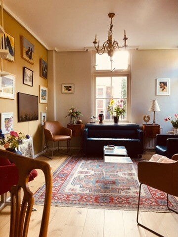 De woonkamer bestaat uit een zitgedeelte met TV en open haard(gas) en een ronde eettafel. De wanden zijn versierd met schilderijen van mijn overleden echtenote.